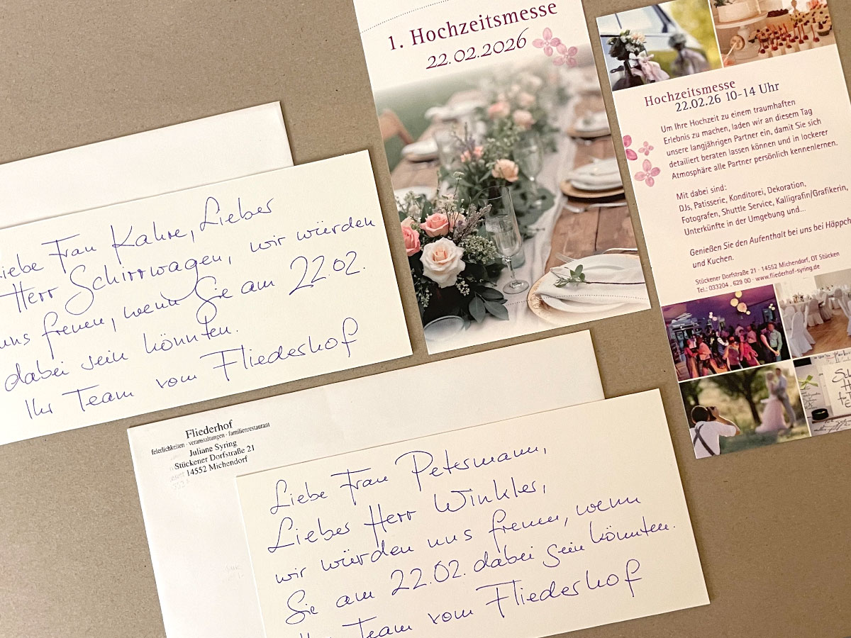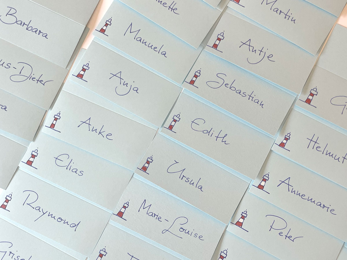 Handgeschriebene Namen, Adressen und Absender wirken immer sehr persönlich. Ob Gästebuch oder Menükarte, persönlichen Anrede oder Urkunde, Tisch- oder Einladungskarten: mit meiner ungewöhnlichen Handschrift verziere ich jedes Stück Papier.