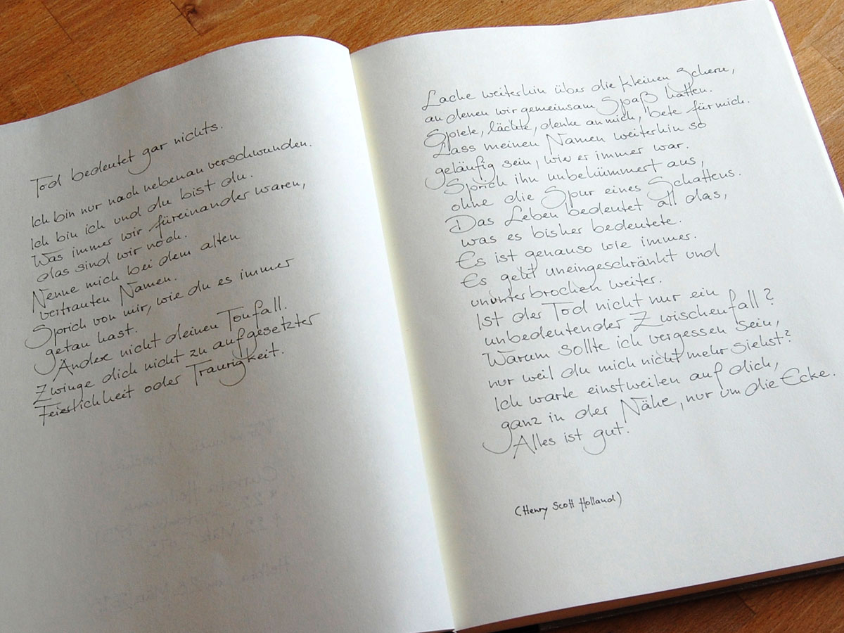 Oben: Gästebucheintragungen · Kondolenzbuch · Grußkarte