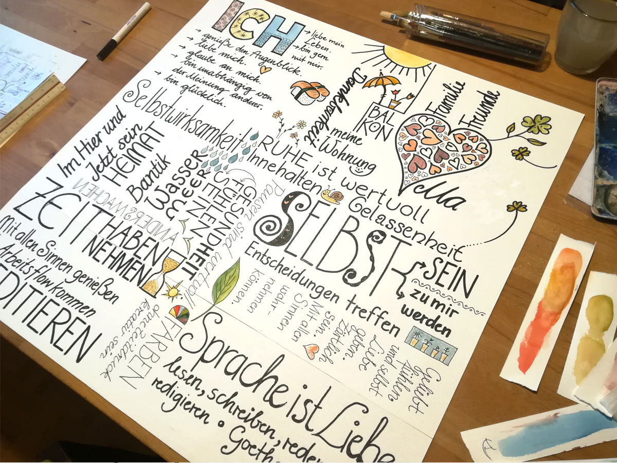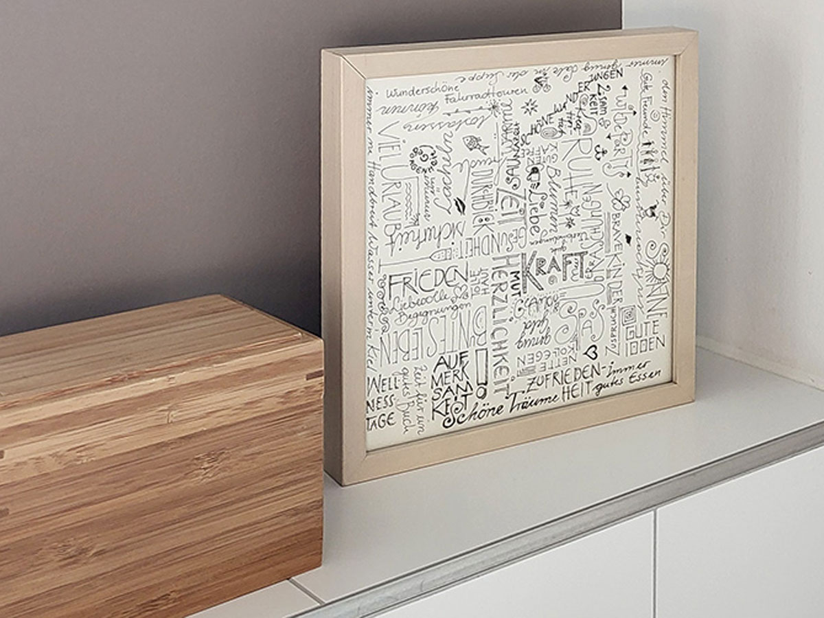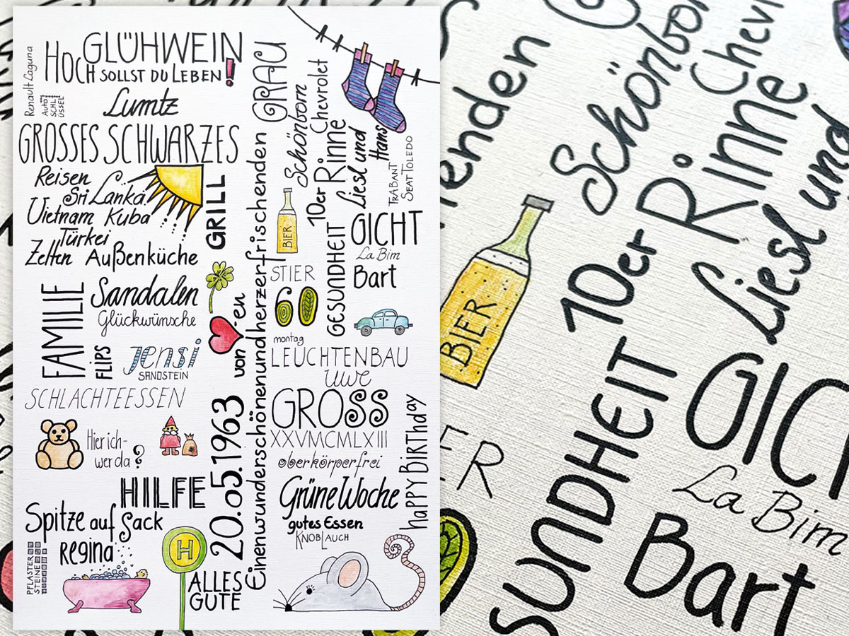 Als Geschenk, z.B. für einen runden Geburtstag, erstelle ich Ihnen aus den einer Anzahl von Wörtern und einfachen Icons eine Art Lebenslauf. Oder Sie haben einen neuen Lebensweg eingeschlagen und möchten sich immer vor Augen führen, was Sie erreicht haben – Dinge, die Ihnen wichtig sind.